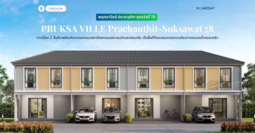 พรีวิว พฤกษาวิลล์ ประชาอุทิศ-สุขสวัสดิ์ 78 (PRUKSA VILLE Prachauthit-Suksawat 78) ทาวน์โฮม 2 ชั้นที่มาพร้อมกับการออกแบบสถาปัตยกรรมอย่างลงตัวและกลมกลืน เป็นพื้นที่ที่ตอบสนองทุกความต้องการของคนทั้งครอบครัว