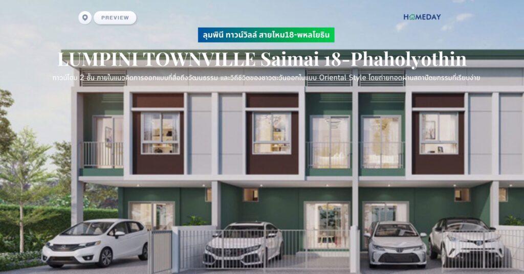 พรีวิว ลุมพินี ทาวน์วิลล์ สายไหม18-พหลโยธิน (LUMPINI TOWNVILLE Saimai 18-Phaholyothin) ทาวน์โฮม 2 ชั้น ภายในแนวคิดการออกแบบที่สื่อถึงวัฒนธรรม และวิถีชีวิตของชาวตะวันออกในแบบ Oriental Style โดยถ่ายทอดผ่านสถาปัตยกรรมที่เรียบง่าย