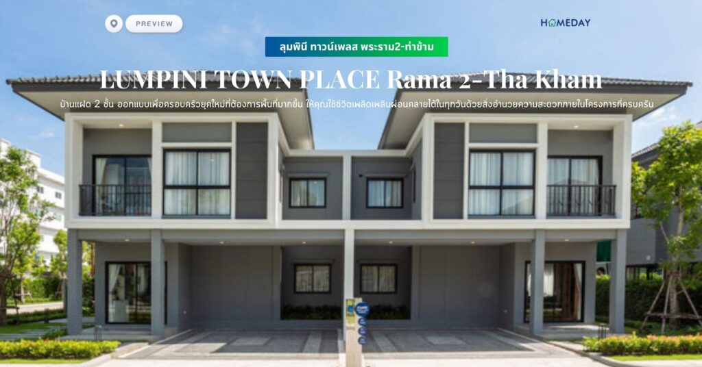 พรีวิว ลุมพินี ทาวน์เพลส พระราม2-ท่าข้าม (LUMPINI TOWNVILLE Rama 2-Tha Kham) บ้านแฝด 2 ชั้น ออกแบบเพื่อครอบครัวยุคใหม่ที่ต้องการพื้นที่มากขึ้น ให้คุณใช้ชีวิตเพลิดเพลินผ่อนคลายได้ในทุกวันด้วยสิ่งอำนวยความสะดวกภายในโครงการที่ครบครัน