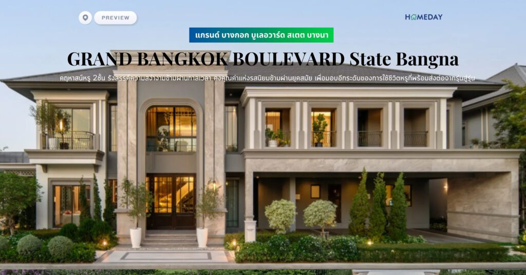 พรีวิว แกรนด์ บางกอก บูเลอวาร์ด สเตต บางนา (GRAND BANGKOK BOULEVARD State Bangna) คฤหาสน์หรู 2ชั้น รังสรรค์ความสง่างามข้ามผ่านกาลเวลา คงคุณค่าแห่งรสนิยมข้ามผ่านยุคสมัย เพื่อมอบอีกระดับของการใช้ชีวิตหรูที่พร้อมส่งต่อจากรุ่นสู่รุ่น