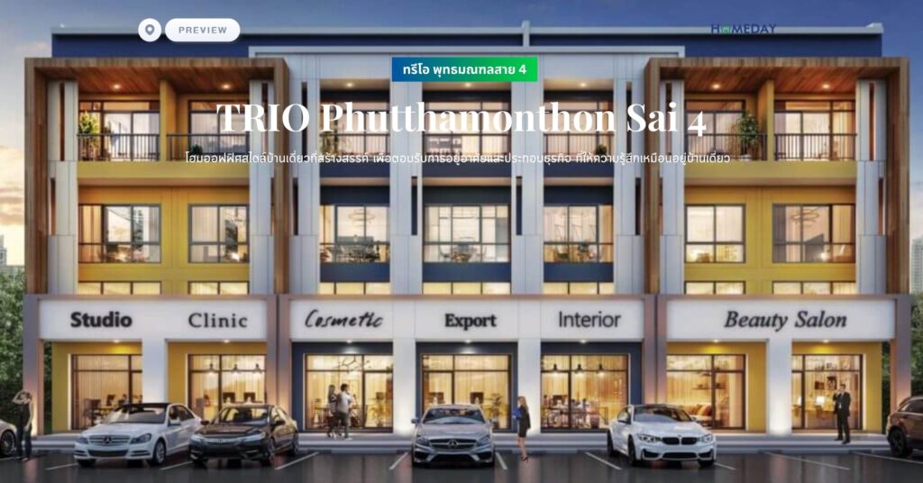 พรีวิว ทรีโอ พุทธมณฑลสาย 4 (TRIO Phutthamonthon Sai 4) โฮมออฟฟิศสไตล์บ้านเดี่ยวที่สร้างสรรค์ เพื่อตอบรับการอยู่อาศัยและประกอบธุรกิจ ที่ให้ความรู้สึกเหมือนอยู่บ้านเดี่ยว