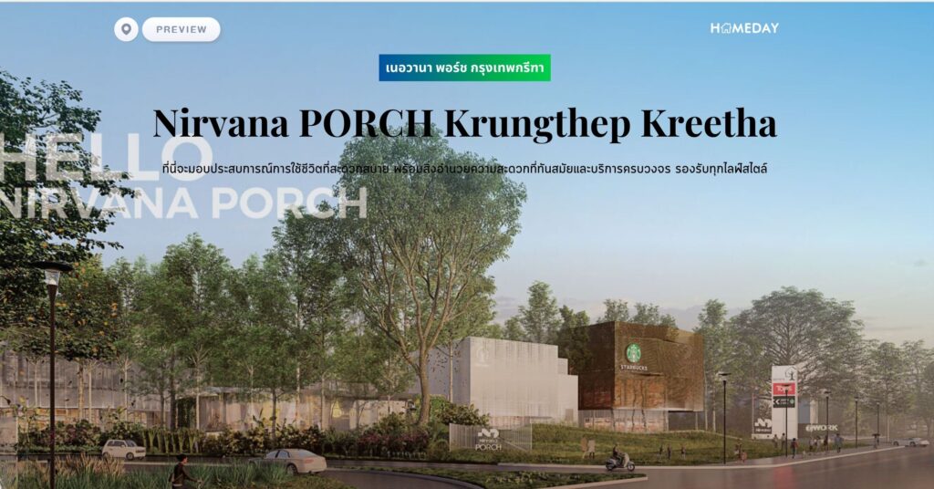 พรีวิว เนอวานา พอร์ช กรุงเทพกรีฑา (Nirvana PORCH Krungthep Kreetha) ที่นี่จะมอบประสบการณ์การใช้ชีวิตที่สะดวกสบาย พร้อมสิ่งอำนวยความสะดวกที่ทันสมัยและบริการครบวงจร รองรับทุกไลฟ์สไตล์