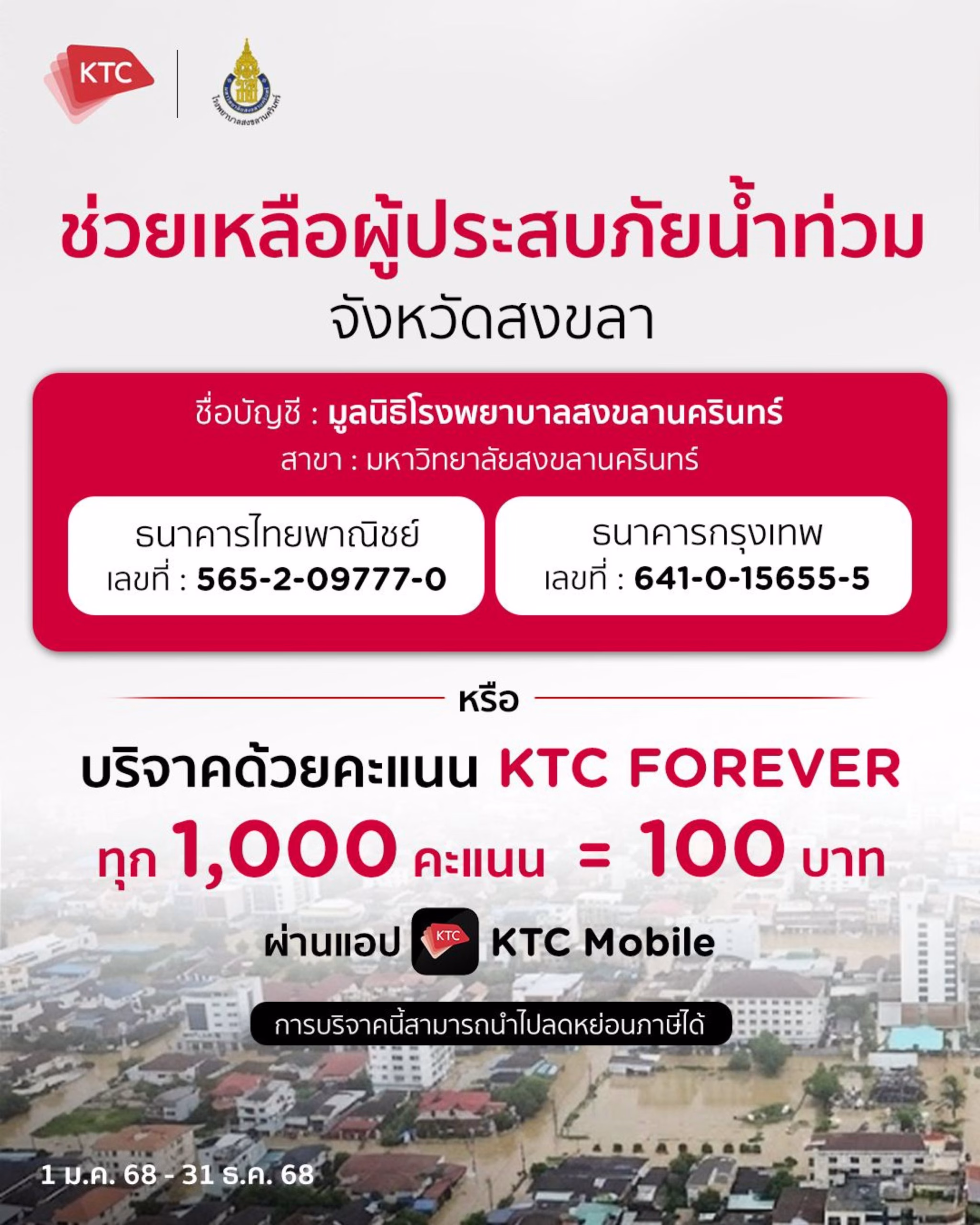 “เคทีซี” หรือ บริษัท บัตรกรุงไทย จำกัด (มหาชน) ชวนสมาชิกบัตรฯ ร่วมสมทบทุนช่วยเหลือ ผู้ประสบอุทกภัยในภาคใต้ ผ่านสภากาชาดไทย มูลนิธิโรงพยาบาลสงขลานครินทร์ และมูลนิธิรักษ์ไทย โดยสามารถเลือกชำระเงินบริจาคด้วยบัตรเครดิตเคทีซีที่มูลนิธิฯ หรือใช้คะแนน KTC FOREVER ทุก 1,000 คะแนนแทนเงินบริจาค 100 บาท ผ่านแอป KTC Mobile เพื่อช่วยสนับสนุนการจัดหาอาหาร ยารักษาโรค อุปกรณ์ ยังชีพ และการฟื้นฟูพื้นที่ไปยังชุมชนที่กำลังเผชิญสถานการณ์อย่างเร่งด่วน