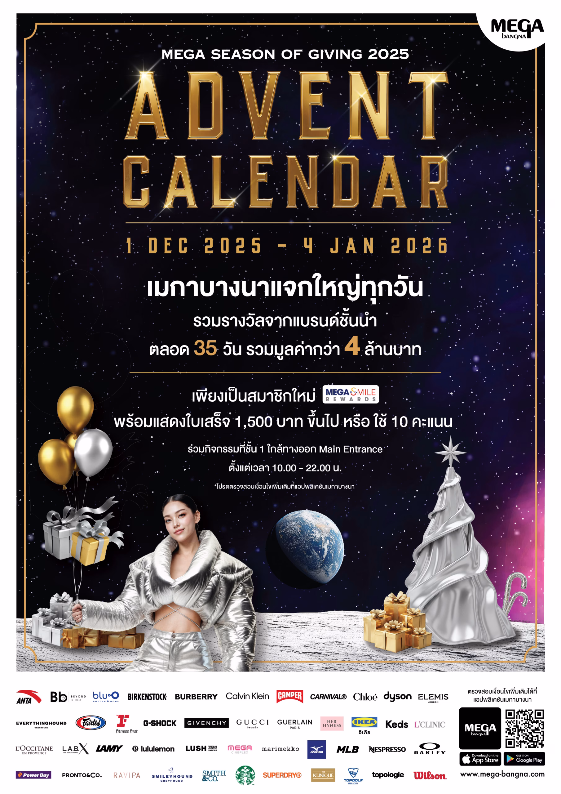 ศูนย์การค้าเมกาบางนา แหล่งช้อปปิ้งที่ใหญ่ที่สุดแห่งกรุงเทพฯ ฝั่งตะวันออก พร้อมเติมเต็มประสบการณ์การใช้ชีวิตให้ทุกๆ วันมีความสุขมากยิ่งขึ้น ด้วยแนวคิด YOUR EVERYDAY MEETING PLACE จับมือผู้เช่าภายในศูนย์การค้าฯ กว่า 44 ร้านค้าชั้นนำ มอบสิทธิพิเศษส่งท้ายปี แจกของรางวัลใหญ่มอบความสุขให้นักช้อปทุกคน กับแคมเปญ ADVENT CALENDAR ภายใต้แคมเปญหลัก MEGA SEASON OF GIVING 2025 เพียงสมัครสมาชิกใหม่เมกา สไมล์ รีวอร์ดส พร้อมแสดงใบเสร็จ 1,500 บาทขึ้นไป หรือสมาชิกใช้ 10 คะแนน รับสิทธิ์คว้ารางวัลใหญ่ได้ทุกวัน ตลอด 35 วัน รวมมูลค่ากว่า 4 ล้านบาท โดยลูกค้าสามารถร่วมเล่นเกมได้บริเวณ ชั้น 1 ใกล้ทางออกเมน เอนทรานซ์ ตั้งแต่เวลา 10.00 – 22.00 น. ระหว่างวันที่ 1 ธันวาคม 2568 – 4 มกราคม 2569