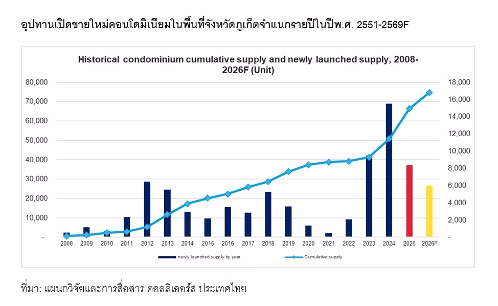 สำหรับภาพรวมอุปทานการเปิดขายใหม่ของตลาดคอนโดมิเนียมในพื้นที่จังหวัดภูเก็ตในปีที่ผ่านมาพบว่า มีโครงการคอนโดมิเนียมเปิดขายใหม่ในพื้นที่จังหวัดภูเก็ตมากถึง 8,372  ยูนิต จากโครงการคอนโดมิเนียมทั้งหมดมากถึง 23 โครงการ มูลค่าการลงทุนรวมมากถึง 47,349  ล้านบาท  และแน่นอนว่าทำเลย่านบางเทา เชิงทำเล กะตะ กะรน ราไวย์ และในพื้นที่ใจกลางเมืองภูเก็ต ยังคงเป็นพื้นที่สำคัญที่ผู้พัฒนาแทบทุกรายมองเห็นถึงโอกาสการพัฒนา ซึ่งคาดการณ์ว่ายังมีโครงการคอนโดมิเนียมรอเปิดขายใหม่อีกกว่า 6,000 ยูนิตในปี 2569  และส่วนใหญ่ยังคงเป็นการพัฒนาของผู้พัฒนารายใหญ่ในตลาด