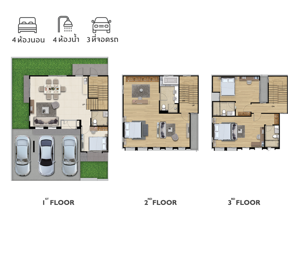 บ้านแฝด 243-249 ตร.ม. 3 ชั้น โดดเด่นด้วย Penthouse OnGround บนชั้นสอง พร้อมด้วย 4 ห้องนอน 4 ห้องน้ำ 3 และ Gallery Parking Lot ถึง 3 คัน บนพื้นที่ใช้สอย 243-249 ตร.ม. / 37.0 ตร.ว.