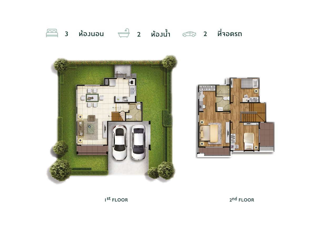 บ้านเดี่ยว 2 ชั้น พื้นที่ใช้สอย 137 ตร.ม. 3 ห้องนอน 2 ห้องน้ำ 2 ที่จอดรถ