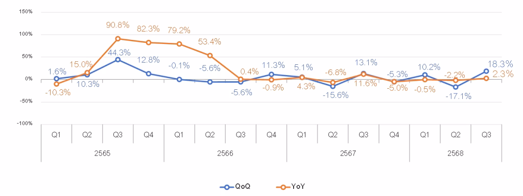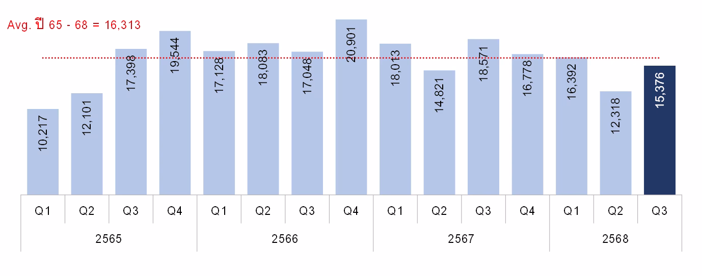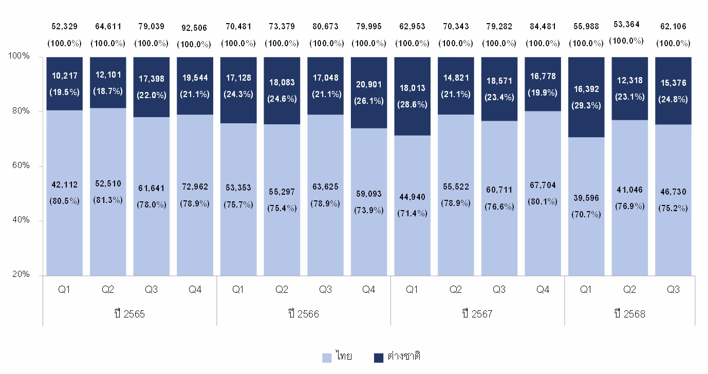 จำนวนหน่วย มูลค่า และพื้นที่ห้องชุดที่โอนกรรมสิทธิ์ให้คนต่างชาติทั่วประเทศไตรมาส 3 ปี 2568พบว่า มีจำนวน 3,844 หน่วย เพิ่มขึ้นร้อยละ 2.3 เมื่อเทียบกับช่วงเดียวกันของปีก่อน (YoY) มีมูลค่า 15,376 ล้านบาท