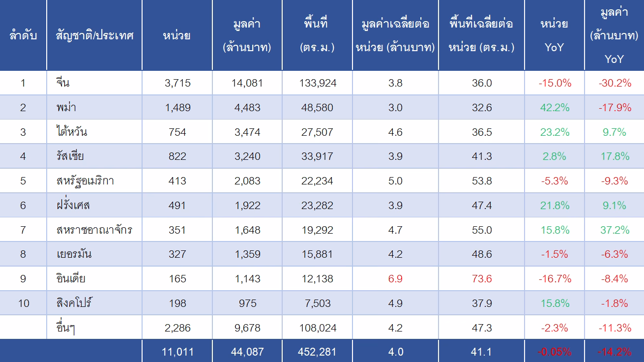 ช่วงเดียวกันของปีก่อน (YoY) โดยสัญชาติของผู้ซื้อส่วนใหญ่เป็นชาวจีน อย่างไรก็ตามทั้งจำนวนและมูลค่านี้