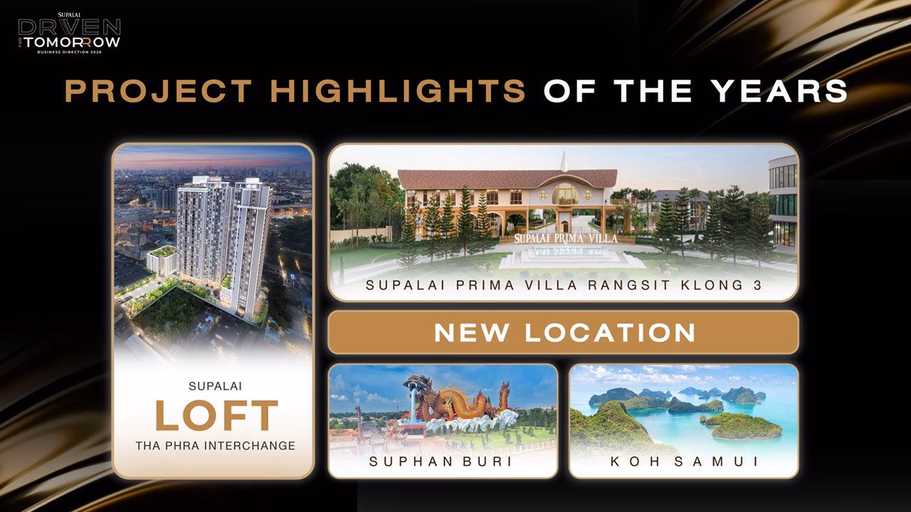 โดยในปี 2568 ที่ผ่านมา บริษัทฯ มีโครงการปิดการขายแล้ว (Sold out) ภายในปี รวม 21 โครงการ มูลค่าโครงการ 35,470 ล้านบาท แบ่งเป็นโครงการแนวราบ 13 โครงการ และโครงการคอนโดมิเนียม 8 โครงการ และในปี 2569 นี้ บริษัทฯ ยังเตรียมเปิดตัวโครงการสำคัญ อาทิ “ศุภาลัย ลอฟท์ ท่าพระ อินเตอร์เชนจ์” และ “ศุภาลัย พรีมา วิลล่า รังสิต คลอง 3” พร้อมขยายการพัฒนาไปยังจังหวัดสุพรรณบุรีและเกาะ สมุย จังหวัดสุราษฎร์ธานี ครอบคลุม 30 จังหวัดทั่วประเทศ