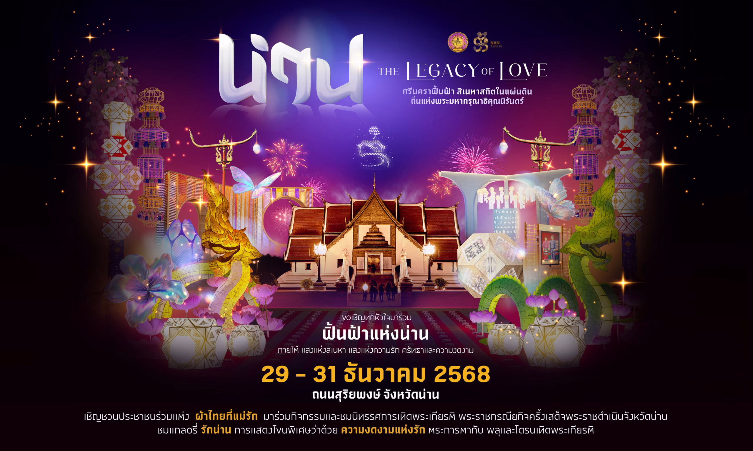 จังหวัดน่าน ประกาศความพร้อมจัดงานยิ่งใหญ่ส่งท้ายปี THE LEGACY OF LOVE ศรีนคราฟื้นฟ้า สิเนหาสถิตในแผ่นดิน ถิ่นแห่งพระมหากรุณาธิคุณนิรันดร์ ชวนนักท่องเที่ยวไทยและชาวต่างชาติ น้อมรำลึกและเทิดพระเกียรติ สมเด็จพระพันปีหลวง ชมนิทรรศกาลเทิดพระเกียรติ “จากรอยพระบาทแรก สู่รอยรักนิรันดร์” พระราชกรณียกิจครั้งเสด็จดำเนินจังหวัดน่าน ผู้ทรงเป็นแสงแห่งความรัก ศิลปะ และปัญญาแห่งแผ่นดิน ร่วมเปิดประสบการณ์ ‘น่านมิติใหม่’ ตลอดช่วงค่ำคืน 29-31 ธันวาคม 2568 คาดเงินสะพัดกว่า 150–200 ล้านบาท ตั้งเป้าเตรียมยกระดับศักยภาพ ก้าวสู่การเป็นเจ้าภาพจัดงานใหญ่ระดับภูมิภาคในอนาคต