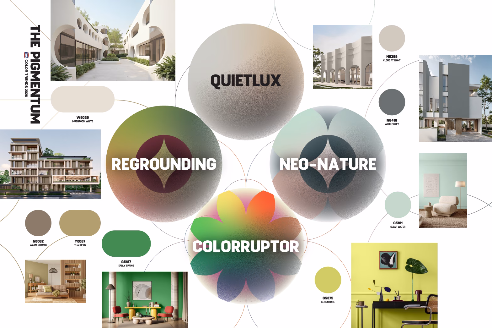 - NEO-NATURE – ธรรมชาติและนวัตกรรมที่กลมกลืน การผสานความงามและความสมดุลของธรรมชาติเข้ากับความก้าวหน้าทางเทคโนโลยีอย่างลงตัว เป็นการสร้างสรรค์พื้นที่ที่รู้สึกสดชื่น มีชีวิตชีวา แต่ยังคงฟังก์ชันและประสิทธิภาพที่ทันสมัย อาทิ สี Thai Herb, สี Forest Treasure