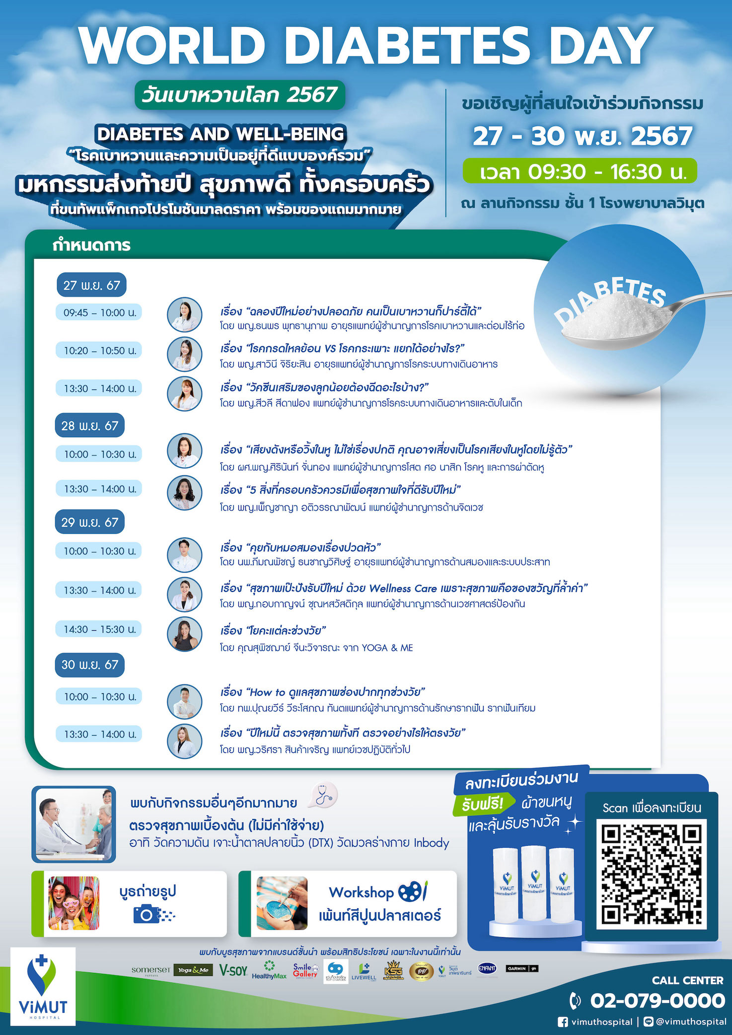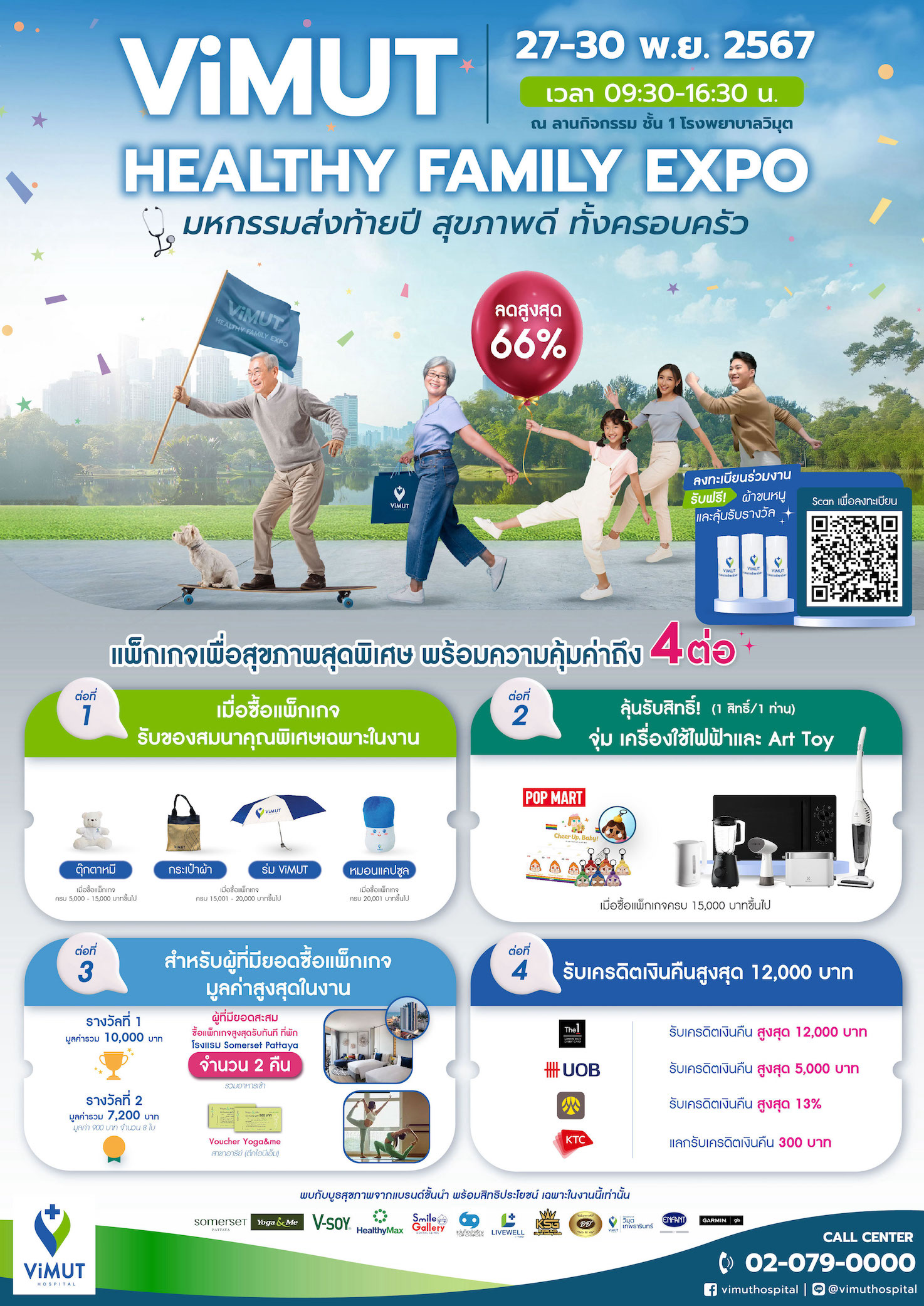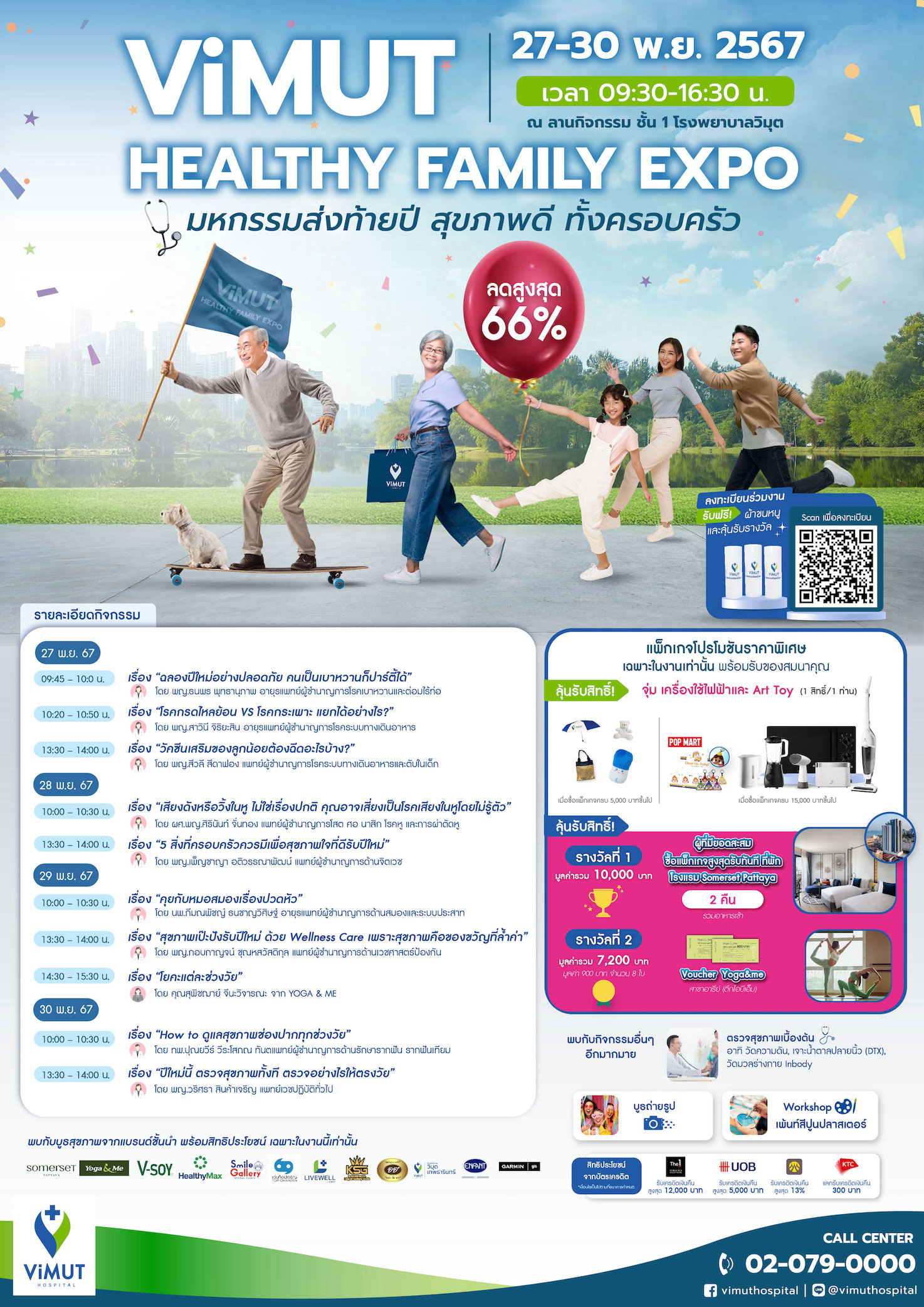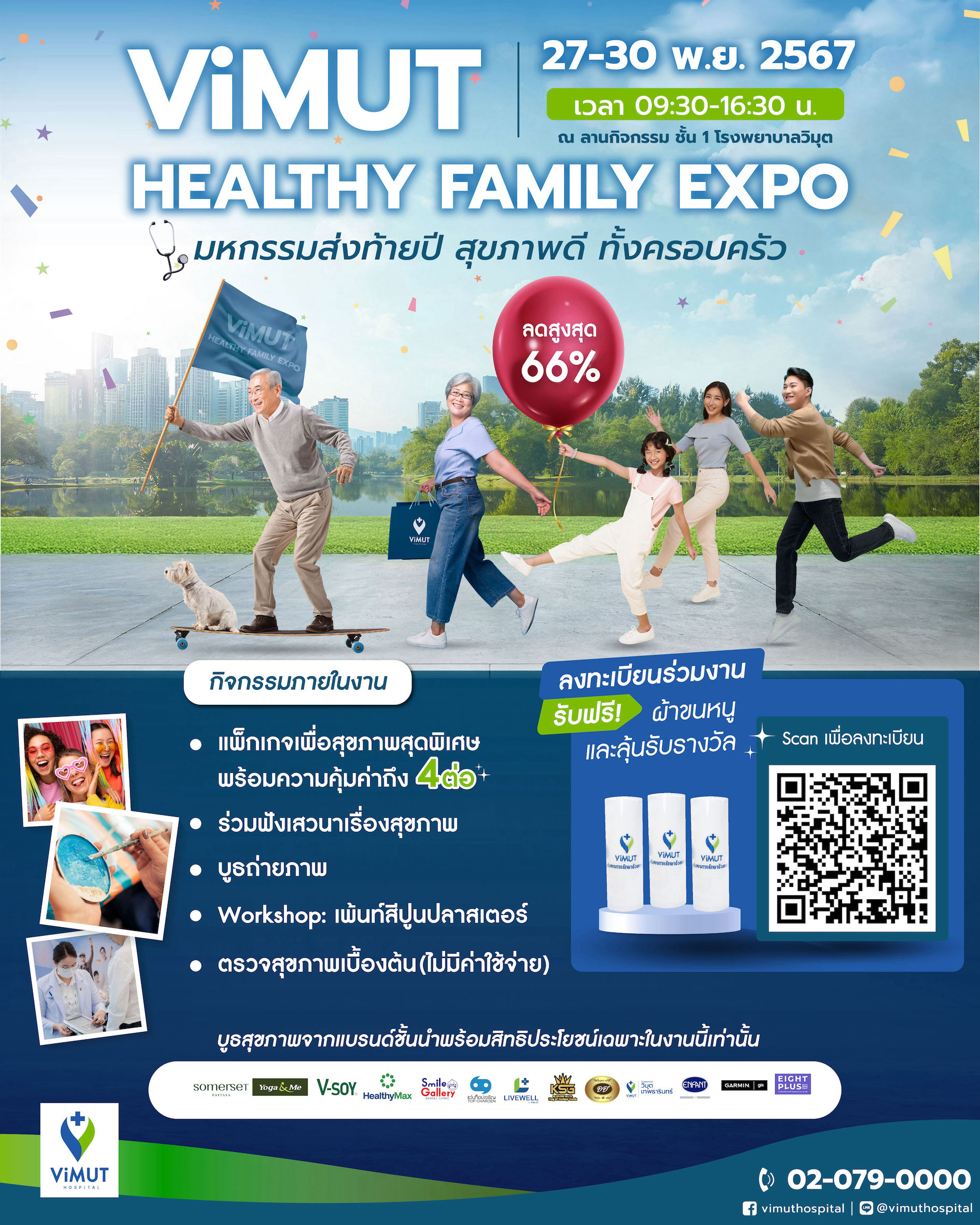 อย่าพลาดกับกิจกรรมดี ๆ ตลอดทั้งงาน ViMUT Healthy Family Expo ในวันที่ 27-30 พ.ย. 67 เวลา 09.30-16.30 น. ที่ชั้น 1 โรงพยาบาลวิมุต เดินทางสะดวกด้วย BTS สถานีสะพานควาย (ทางออก 2) สอบถามข้อมูลเพิ่มเติมได้ที่ 02-079-0000